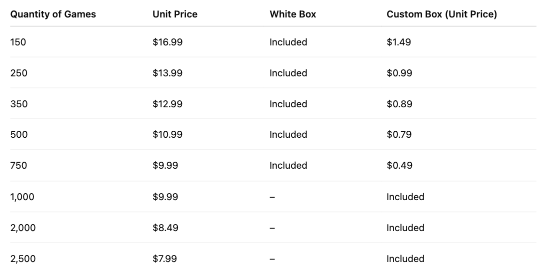 Customization is available starting at 150 units. The price of the personalized box varies depending on the quantity ordered (see the pricing table on the offer page).