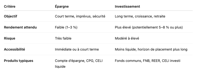 Épargner consiste à mettre de l’argent de côté dans un compte sûr, liquide et accessible rapidement, comme un compte d’épargne à intérêt élevé, un compte chèques ou un certificat de placement garanti (CPG) à court terme.