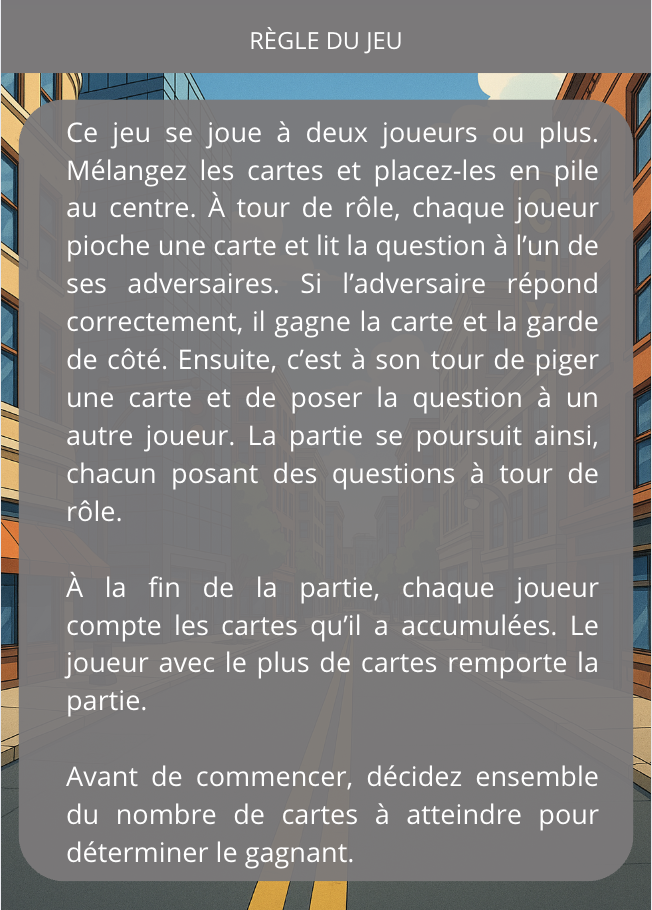 - 54 cartes de questions variées (choix multiple ou vrai ou faux)